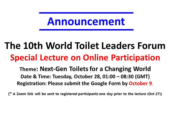 Online Participation Open for the Leaders Forum Special Lecture We are pleased to announce that the 10th Toilet Leaders Forum will feature a Special Lecture, now available for online participation worldwide. Lecture Theme: Next-Gen Toilets for a Changing World Date & Time: Tuesday, October 28, 01:00 – 08:30(GMT) Don't forget to check your local time! Bangladesh: 07:00 – 14:30 Indonesia(WIB): 08:00 – 15:30 South Korea: 10:00 – 17:30 Mongolia(ULAT): 09:00 – 16:30 Philippines: 09:00 - 16:30 United States(ET): Oct 27, 21:00 – Oct 28, 04:30 South Africa: 03:00 – 10:30 |